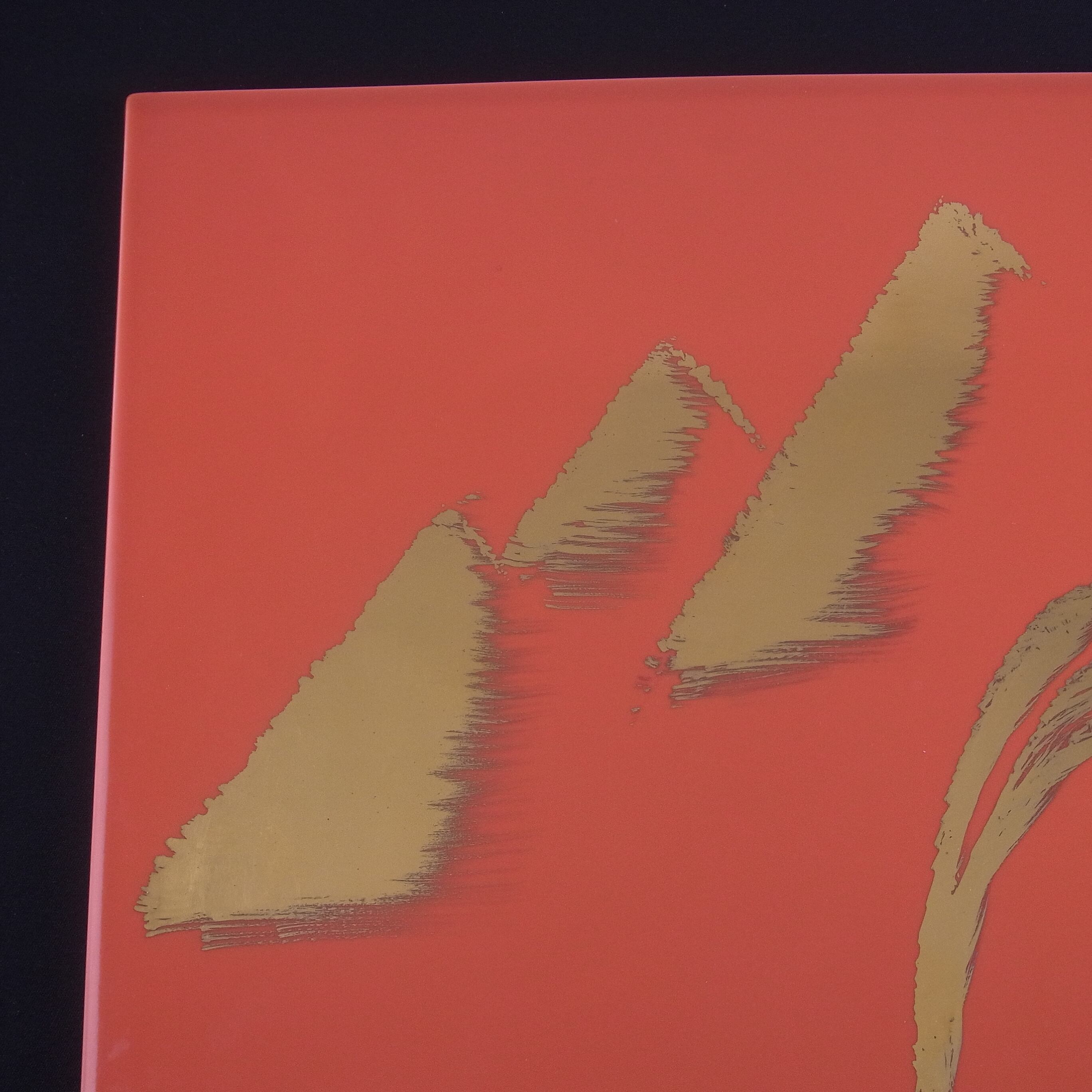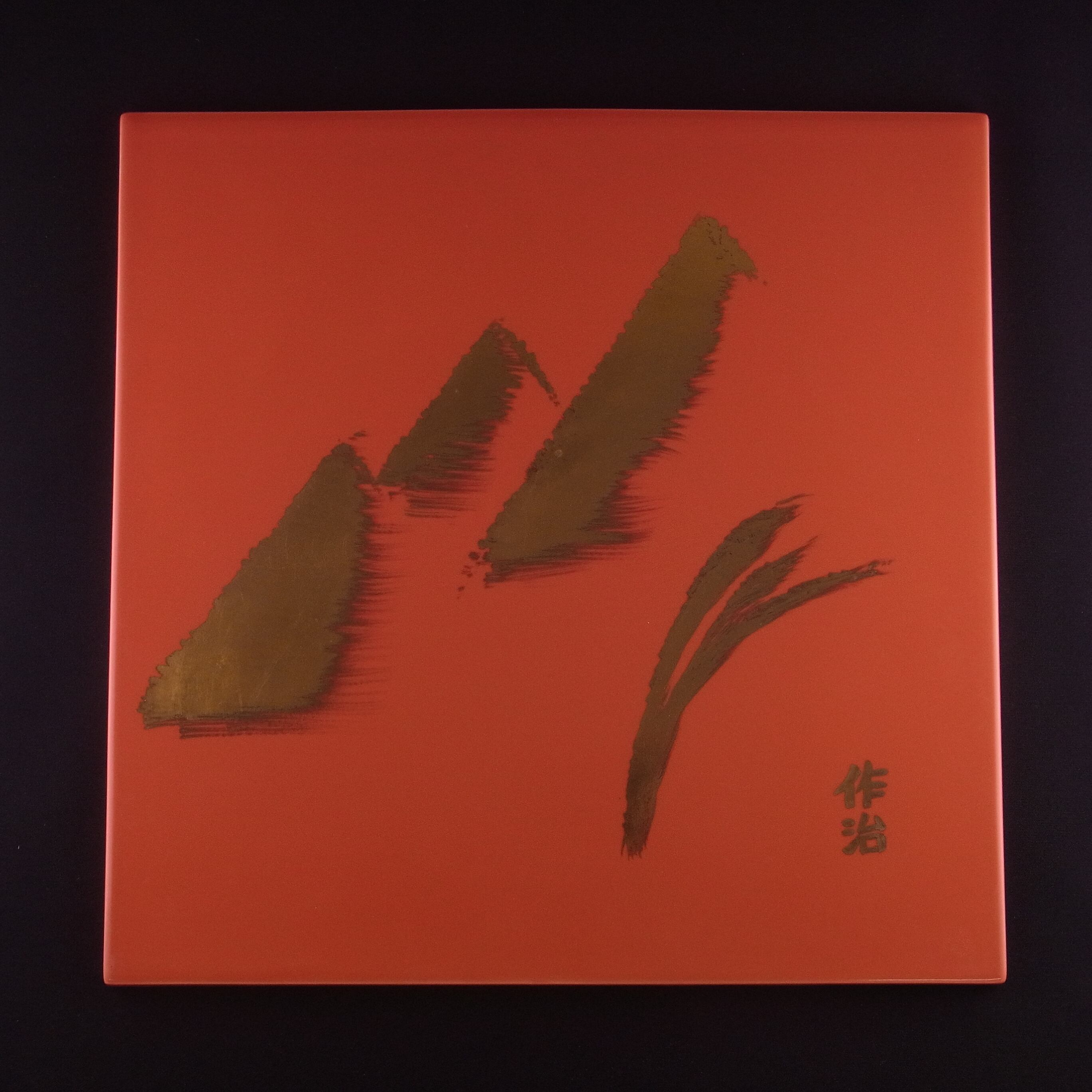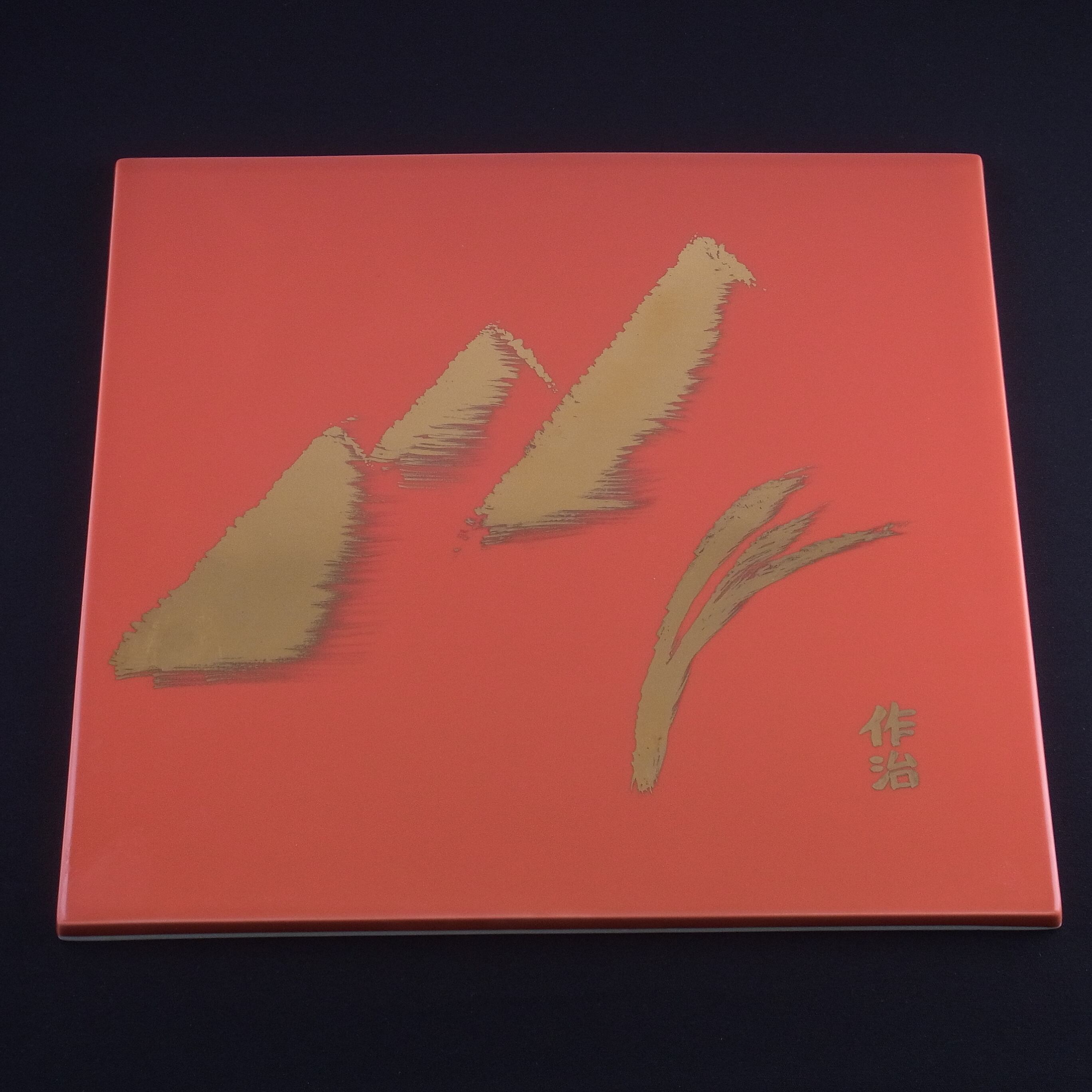 (2)は鮮やかな朱色の地に、黄金でピラミッドのイメージを乗せた正方形の四角陶板です。