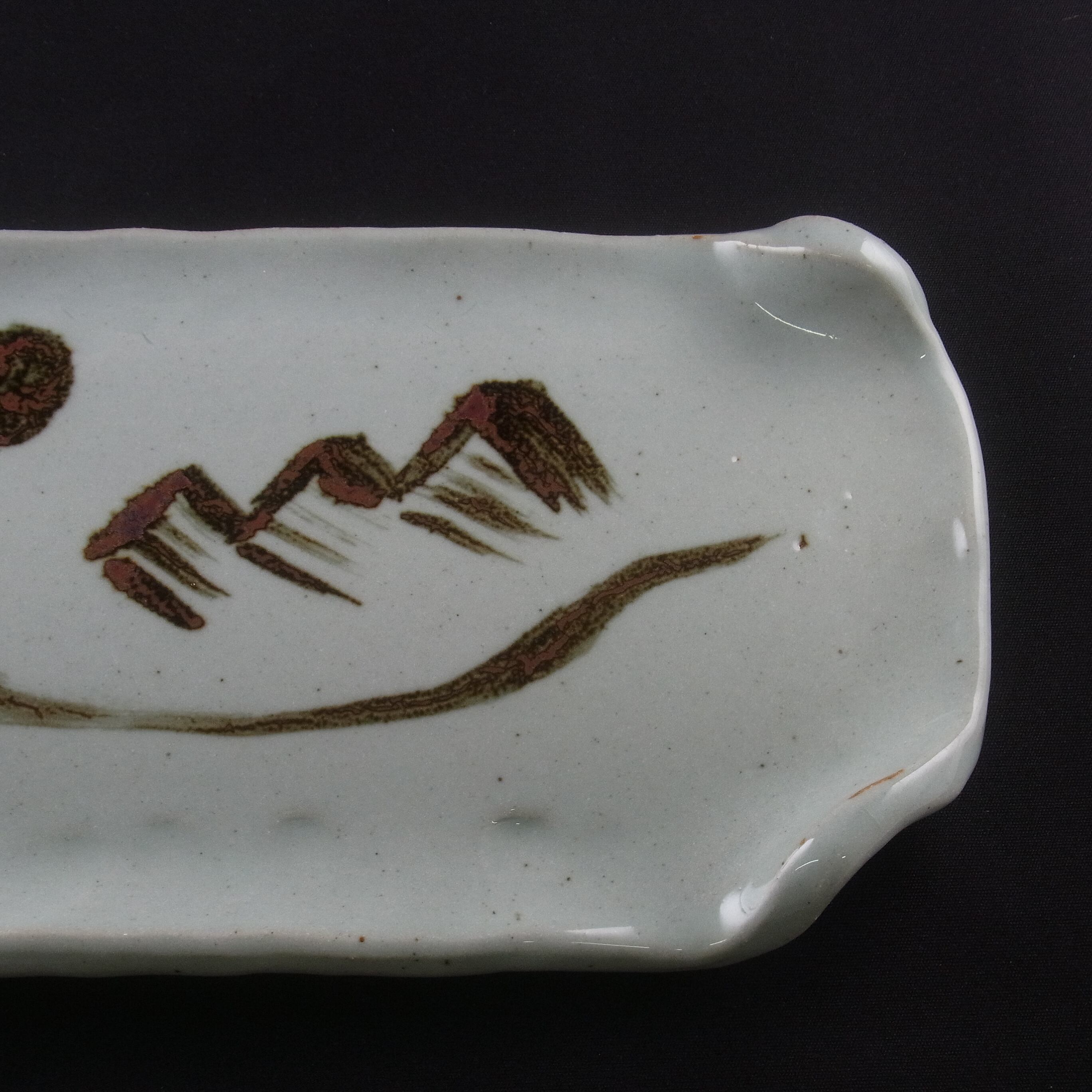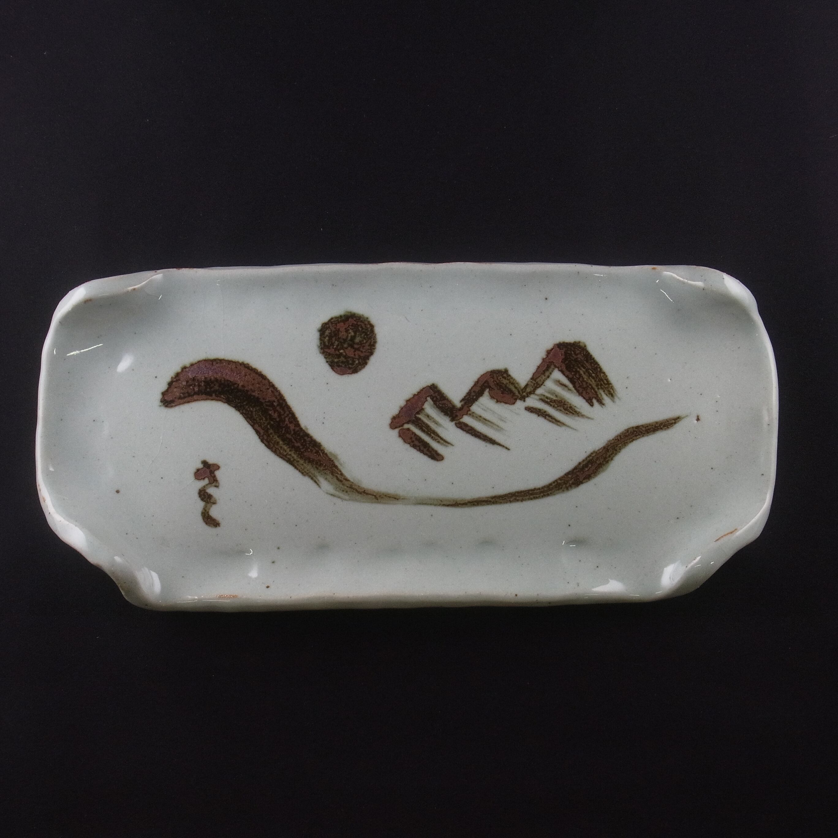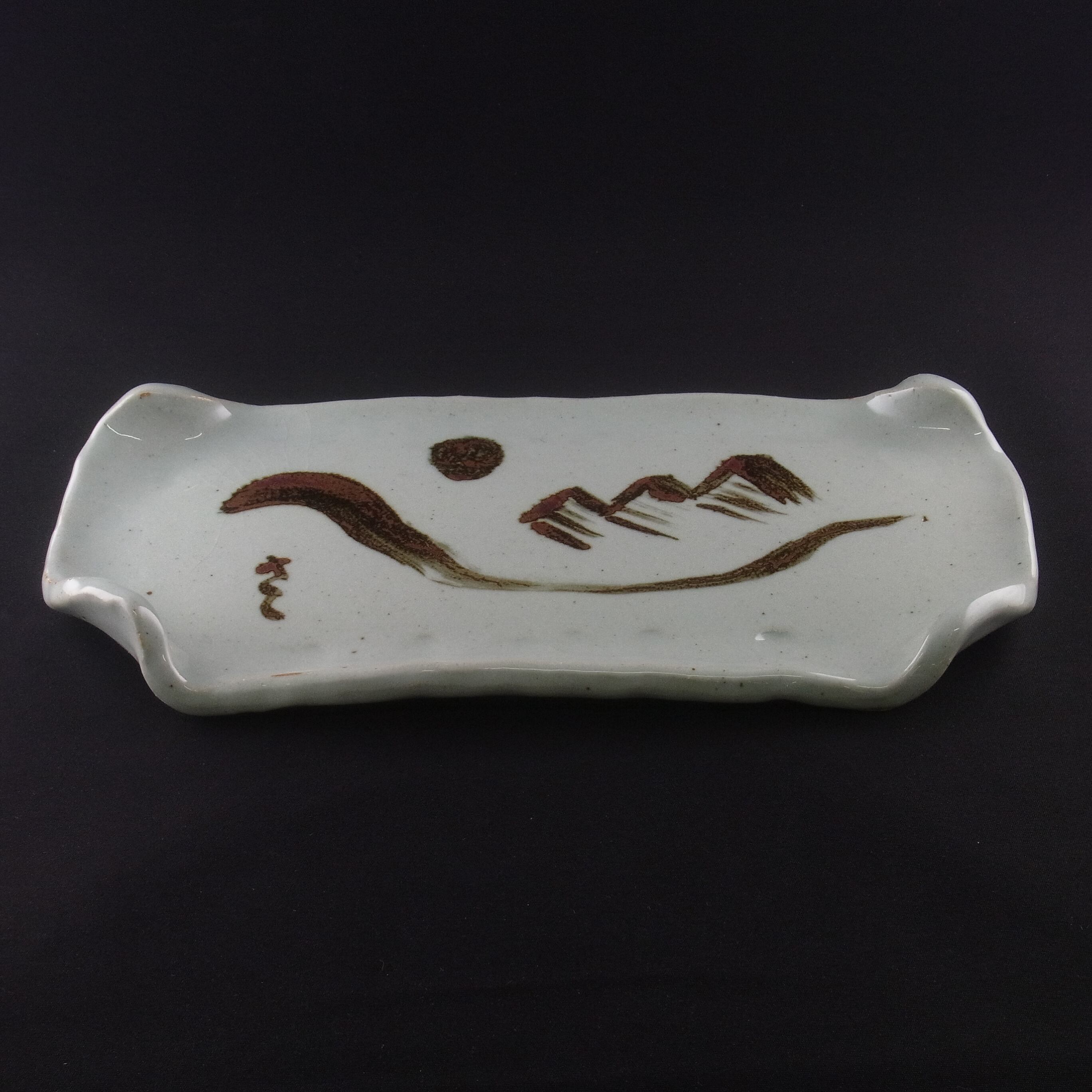 (10)は皿の造形も吉村教授が手がけました。ピラミッドが温もりのある厚手の長皿に錆絵で描かれた作品です。