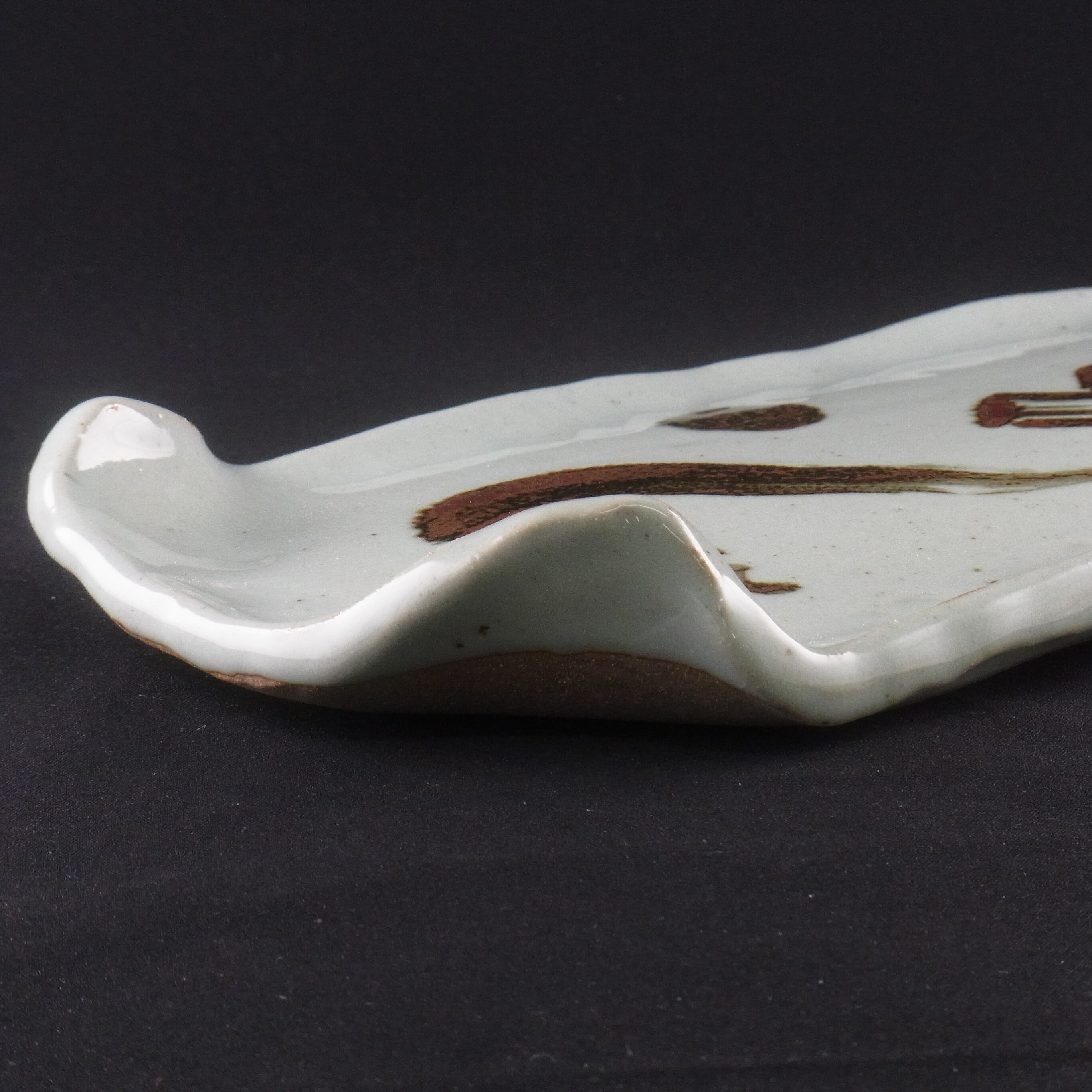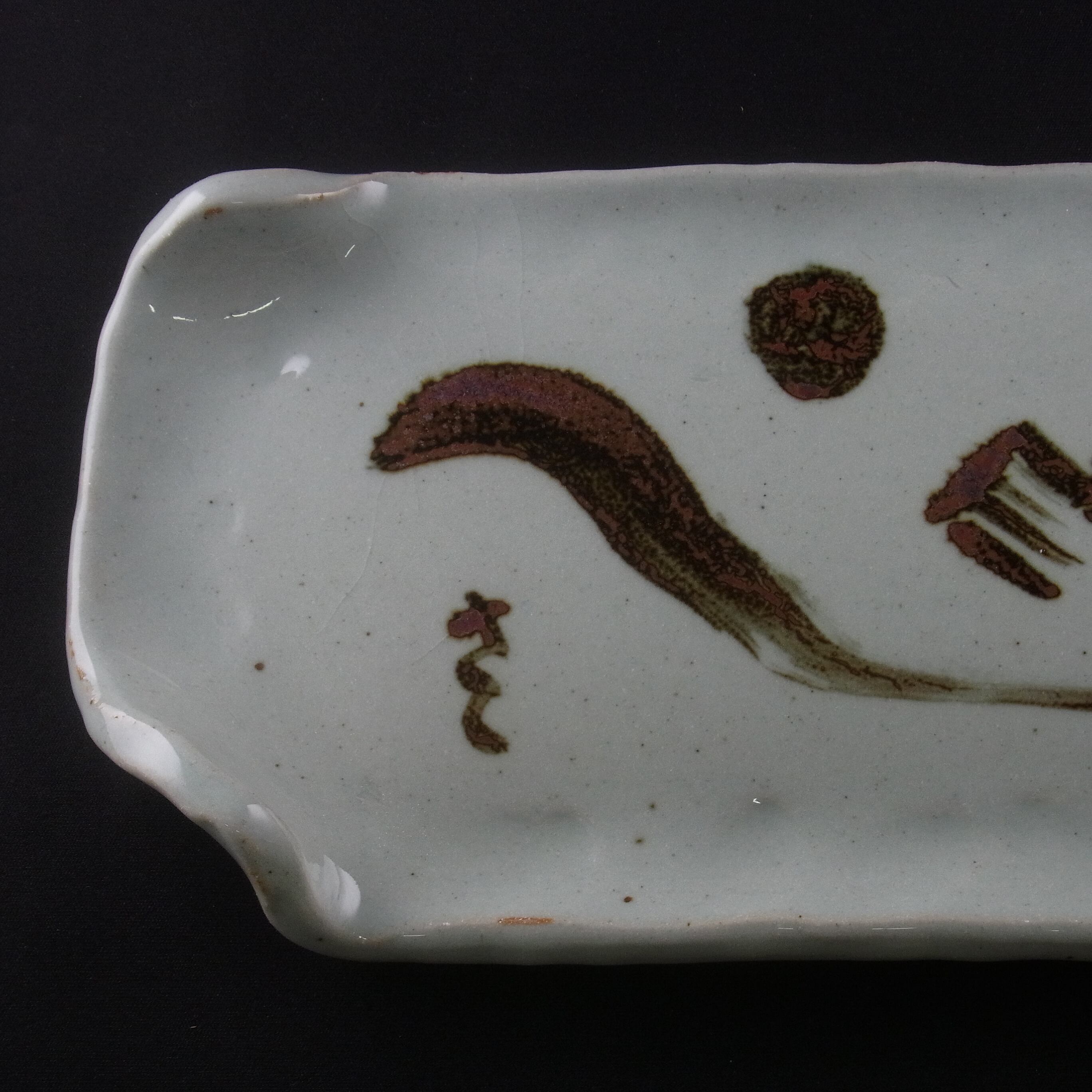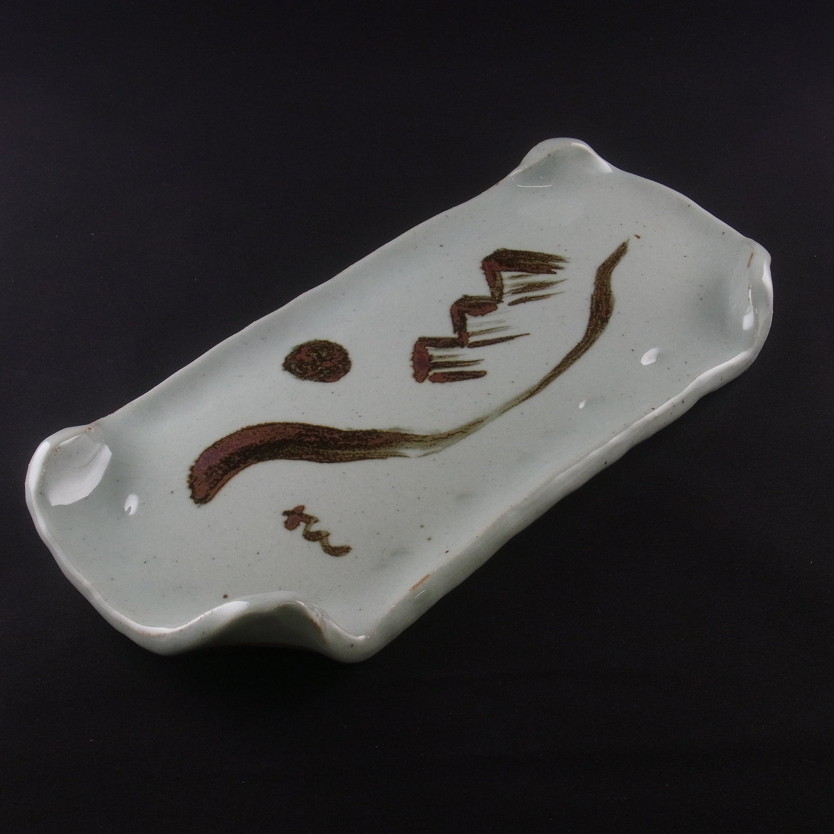 (10)は皿の造形も吉村教授が手がけました。ピラミッドが温もりのある厚手の長皿に錆絵で描かれた作品です。