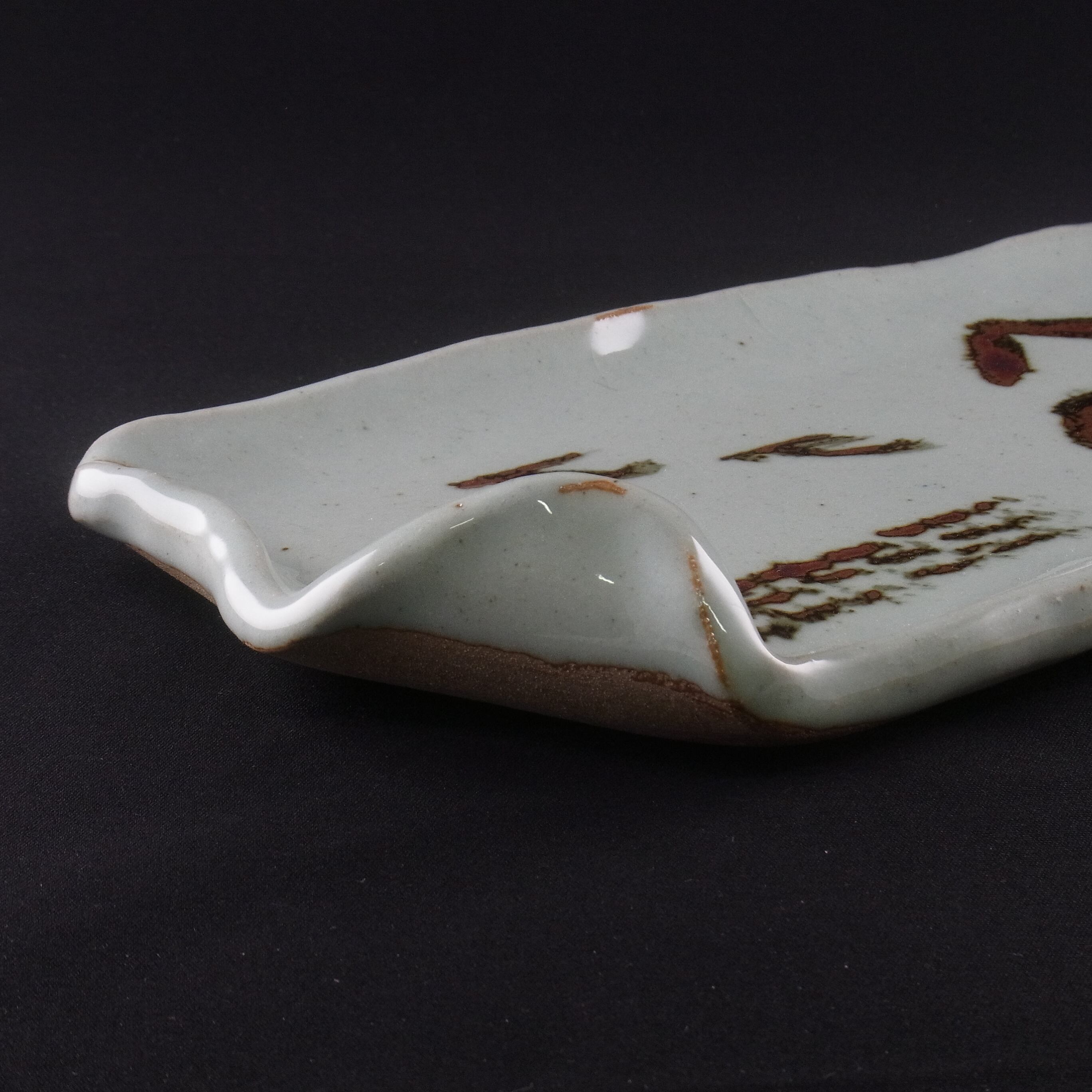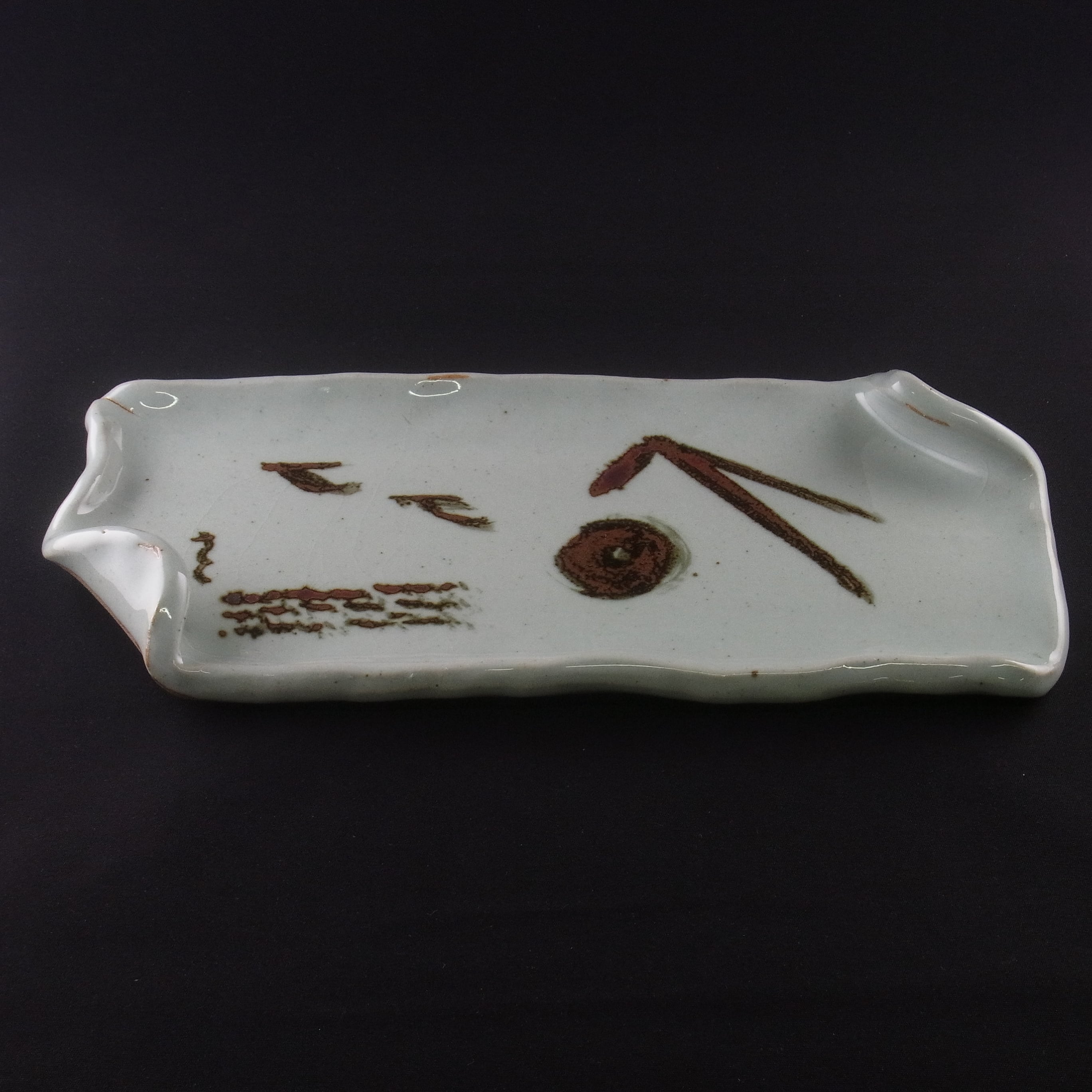 (11)は皿の造形も吉村教授が手がけました。ユニークな形の長皿に、ピラミッドや太陽神ラーを連想させる錆絵の図柄が映える作品です。