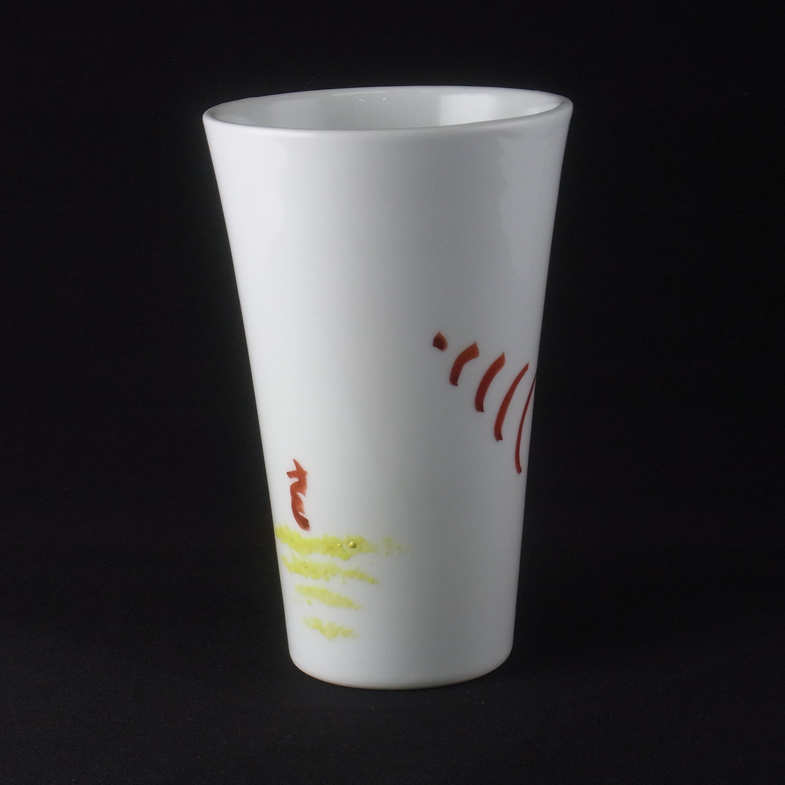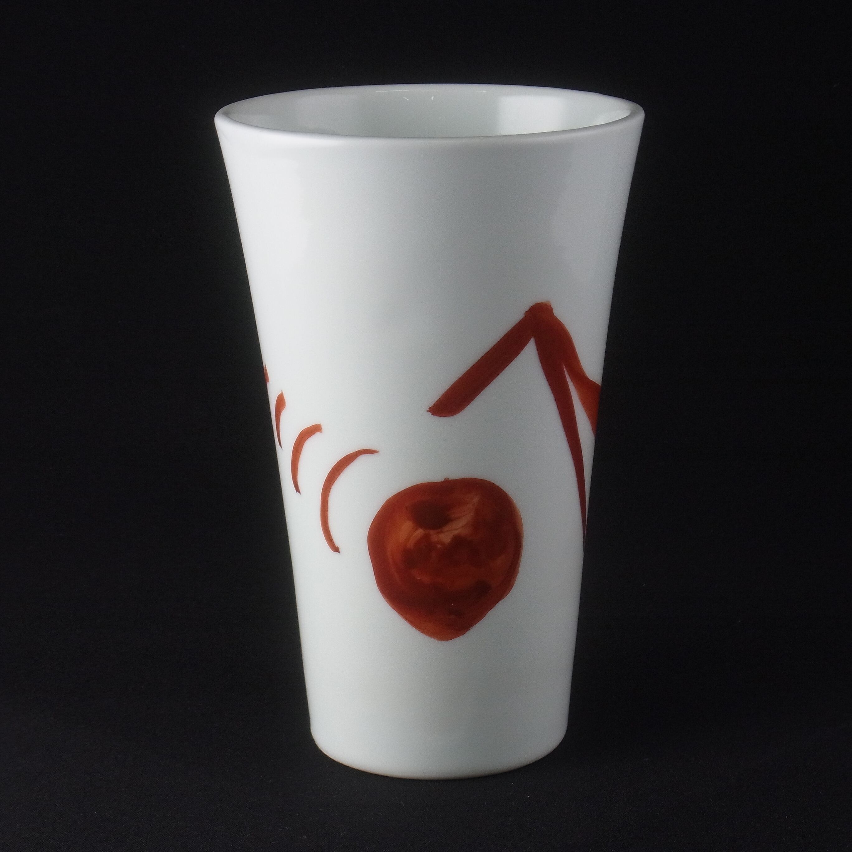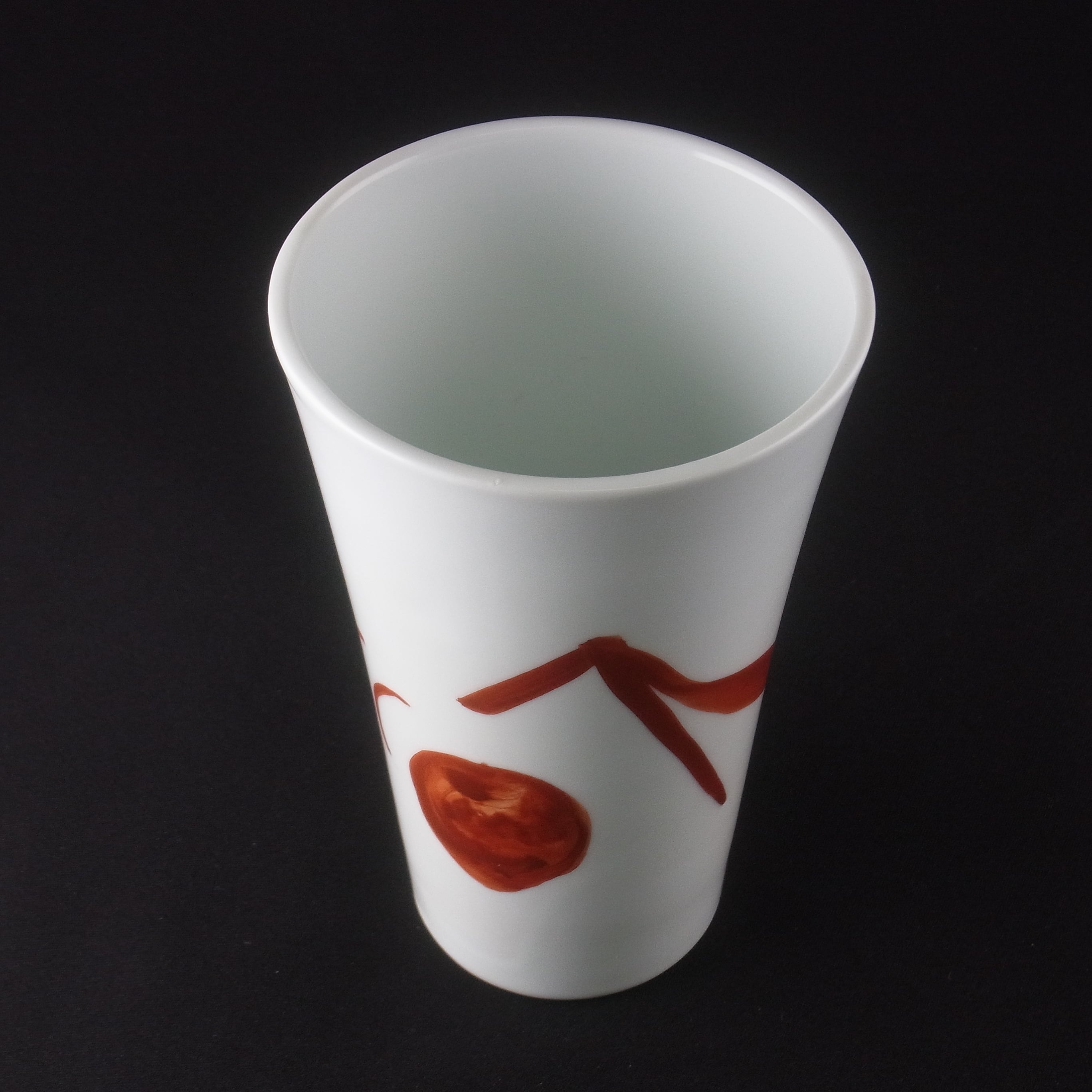 (15)は伊万里焼の白磁に朱色のピラミッドが描かれました。「さく」の署名入り。